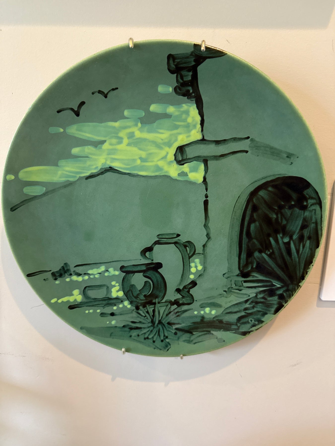 Catalina Glazed Scenic Plaque, Descanso Green, Bud Upton designed and glaze painted then fired in the 30s, features pottery in the design, and is THE plaque shown in our Catalina book! The refined Catalina Glazed Scenic Plaque in Descanso Green is a unique and exquisite piece of pottery ready to hang on your wall, with that added provenance.