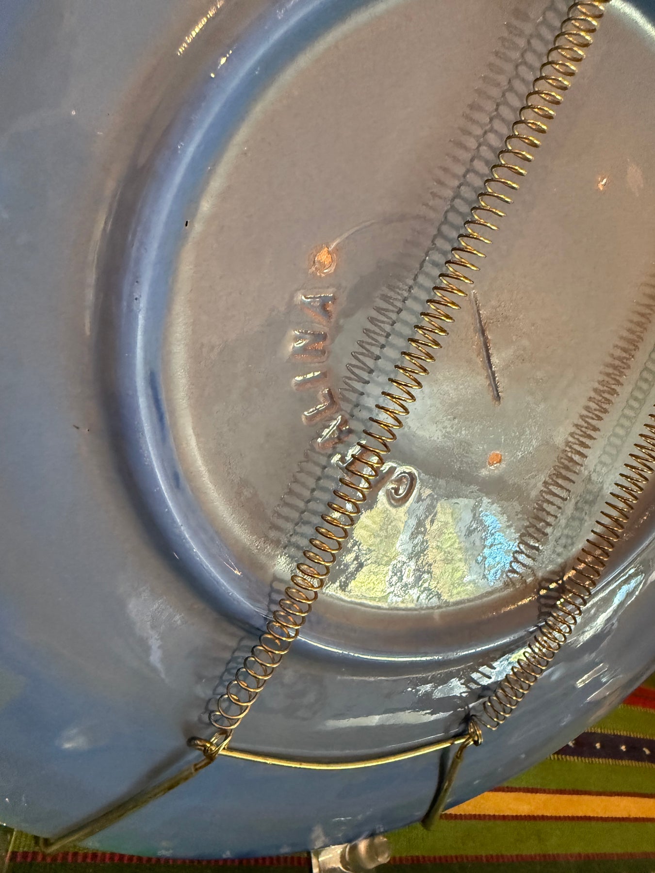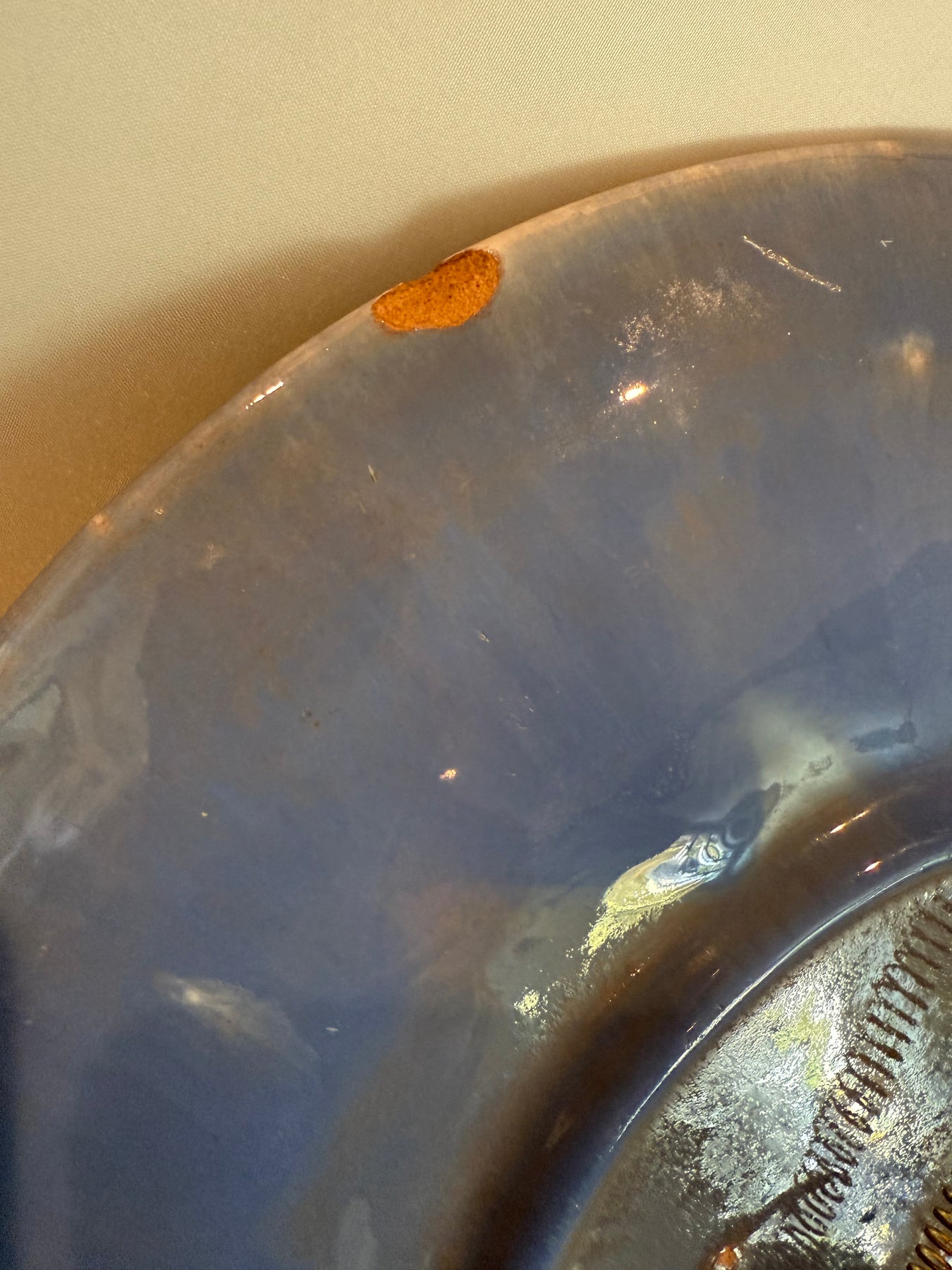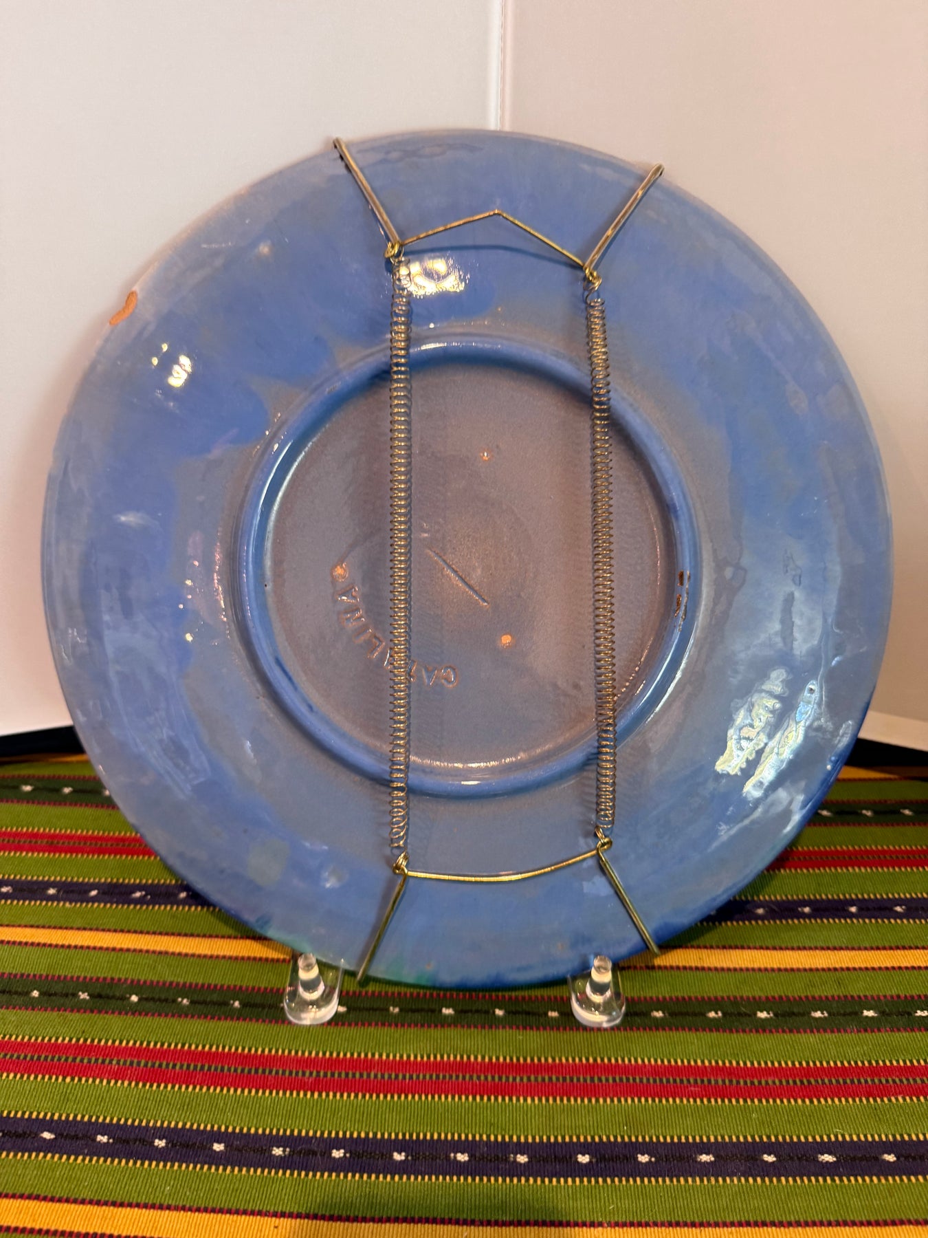 Beautiful Spanish Galleon plaque in a Delph blue glaze background with a depiction of waves seagulls, and clouds. Intricate Cuerda seca detailing much like the finest tile work done during the Spanish Revival period. This is a sought after piece in any Catalina collection. Condition: 1 edge chip on back as shown, thin glaze areas on front as pictured. These colors were hand applied by Island artists back in the day so they are all individual.